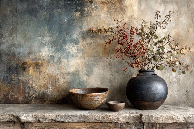 This still life features handmade ceramics and a robust vase with delicate branches and berries, placed against a weathered wall in blue-gray and earthy tones. Soft light and matte textures give the work a painterly quality with depth and nuance.