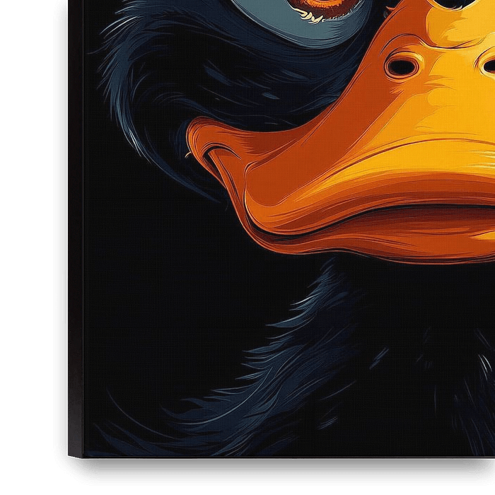 A striking digital artwork of a fierce black duck with glowing orange eyes and sharp, detailed feathers. The dark lighting and dramatic expression create a powerful presence, blending realism with a bold, stylized touch. A character full of attitude and mystery!