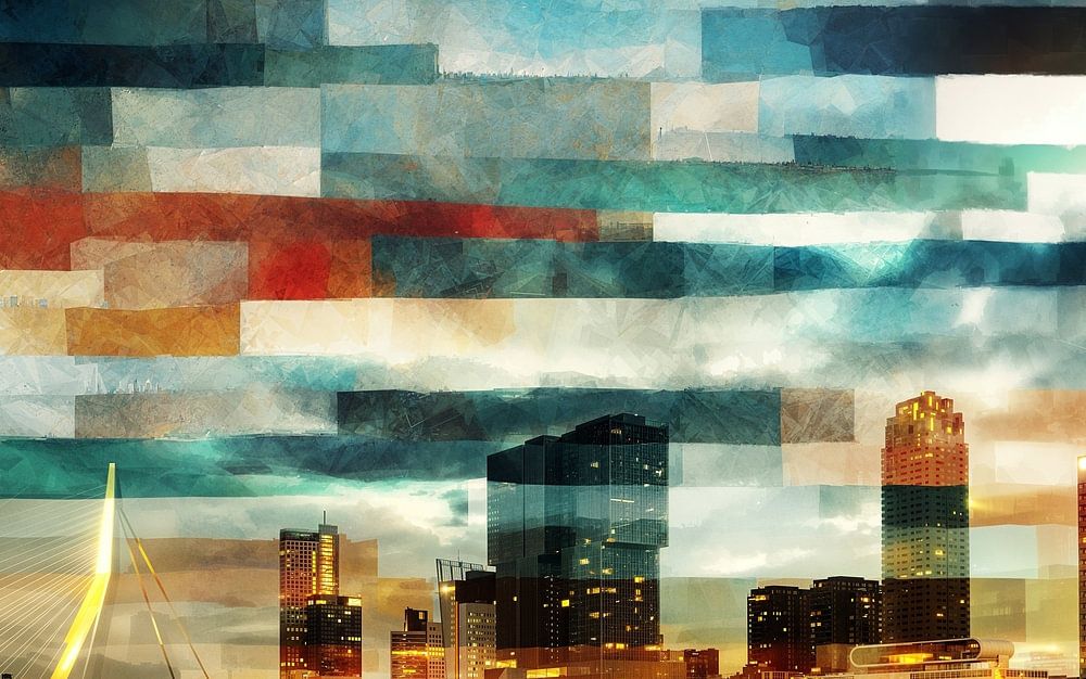 Rotterdam, known for its modern skyline and innovative architecture, is transformed into a picturesque scene in "Dawn over the Maas". The city seems almost magical in the early hours of the day, when the hectic pace of daily life has not yet begun. The abstract elements symbolise the energy and constant transformation of this bustling metropolis.