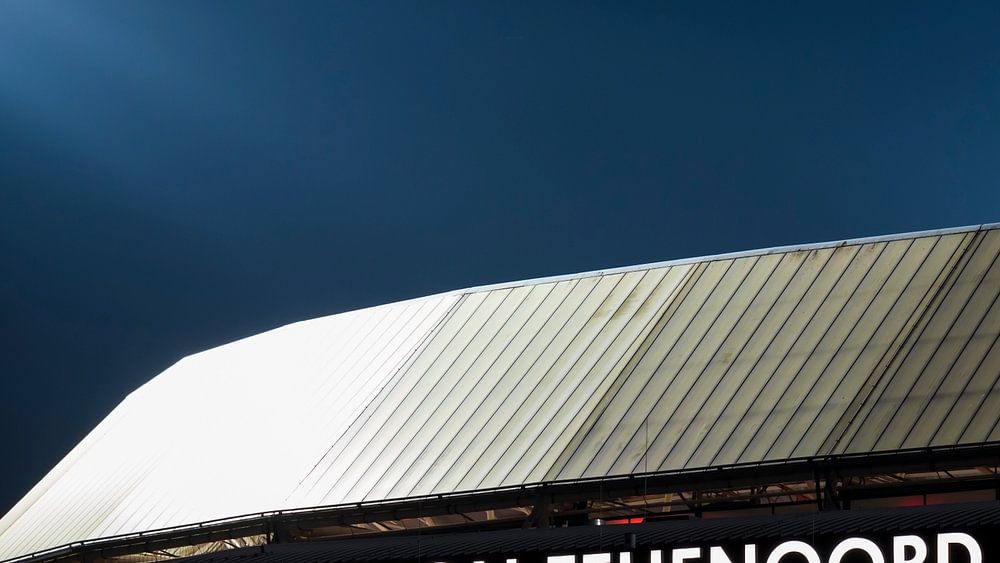 This place has great meaning for many of us. Whether you sit here at all of Feijenoord's home games, or walked in for the first time at your father's hand. De Kuip gets into your heart and never leaves it. Here we see the stadium during an evening match, with the lights on. The lamppost adds an extra dimension to the Kuip, the beam of light falling into the stadium reminiscent of biblical scenes, But here we see no sons of gods. Here work is being done. By the footballers and by the supporters. We are here in Rotterdam!