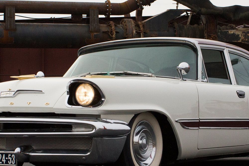 American oldtimer in the (fishing) harbour of Harlingen on a summer evening. It is a DeSoto Firedome, the year of construction is 1957. Classic combined with industrial and straight lines. This makes it a quiet photo.