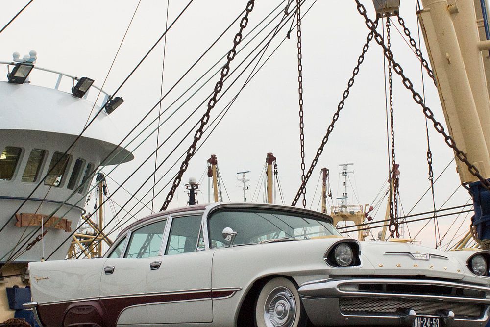 American oldtimer in the (fishing) harbour of Harlingen on a summer evening. It is a DeSoto Firedome, the year of construction is 1957.