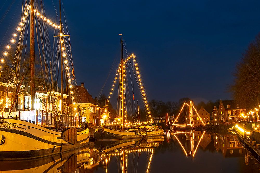 Decorated boats in the harbour of Dokkum in the Netherlands at night during Christmas time