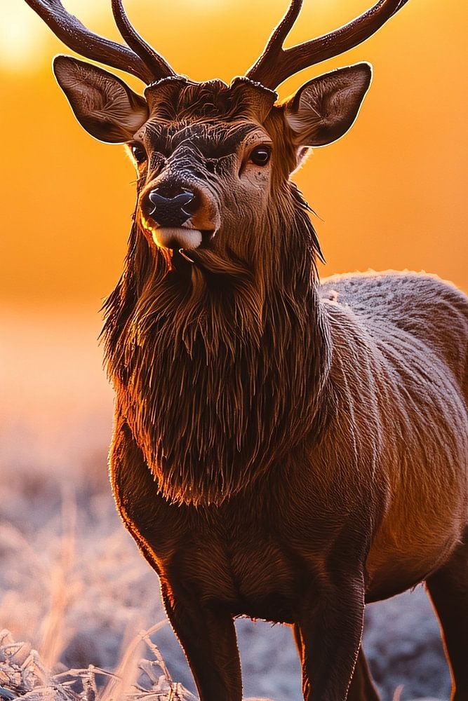 This design shows an impressive image of a deer in the early morning. The animal stands proudly in a frost-covered landscape, enhancing the sense of cold and stillness. The warm colours of the rising sun provide a beautiful contrast to the chilly atmosphere of the landscape. The sun's rays illuminate the deer's imposing antlers, highlighting its strength and majesty. This artwork is an ideal addition to any space where tranquillity, nature and elegance are desired. The combination of nature and soft colours creates a serene atmosphere, perfect for lovers of wildlife and rustic beauty.