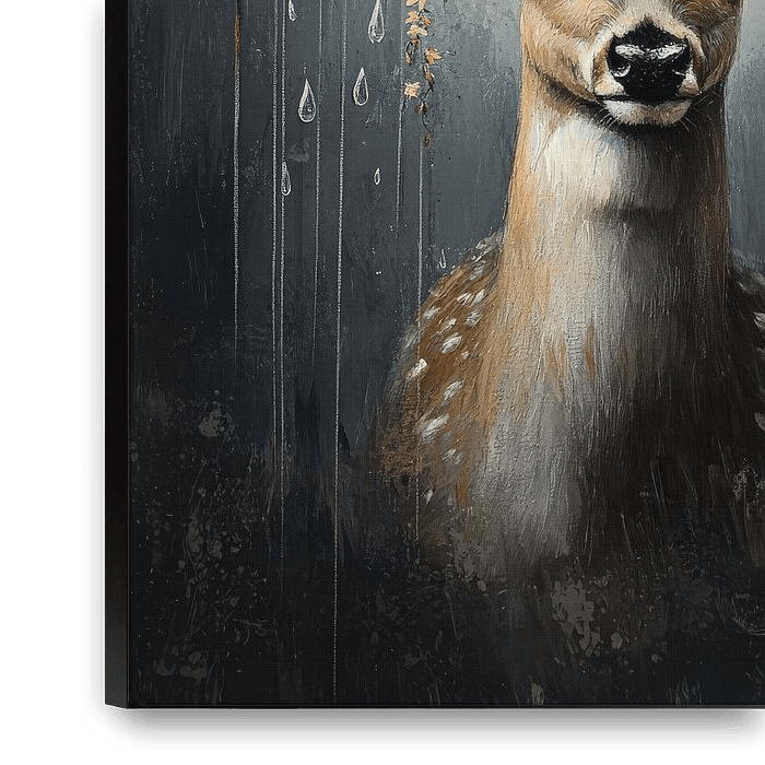 An enchanting painting of a deer with a garland of flowers in its antlers, against a dark, magical background. This work brings together the harmony of nature and art, ideal for atmospheric décor with natural accents.