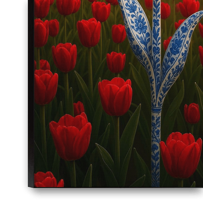 A graceful tulip of Delft blue porcelain rises from a sea of red tulips, bathed in the warm morning light. This enchanting composition unites Dutch heritage, nature and art in one iconic image.