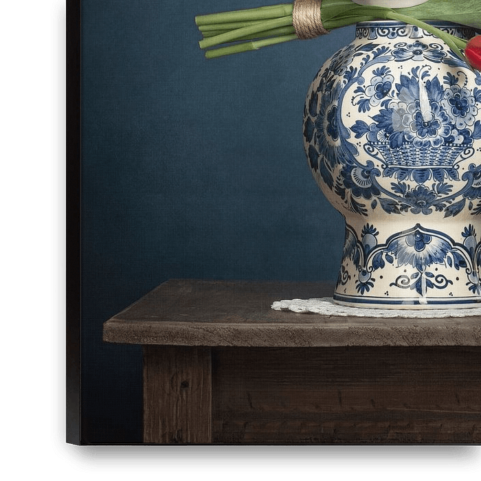Typical Holland. Red / White / Blue, the colors of our flag. A Delft blue vase on an old table with a crocheted rug containing red tulips. An eye catcher in your interior.