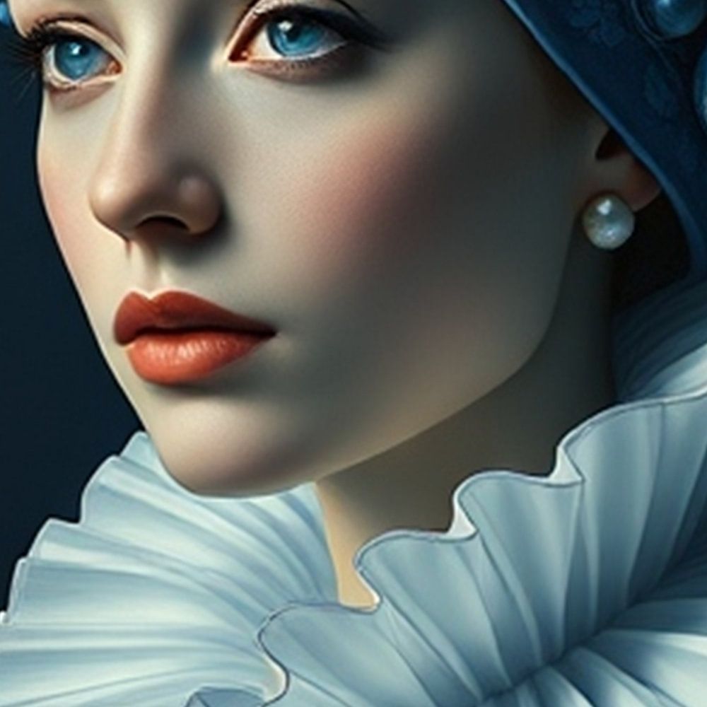 Delft blue old style modern , a portrait of a woman decorated with blue fish on her head and white collar around her neck on a dark blue background.