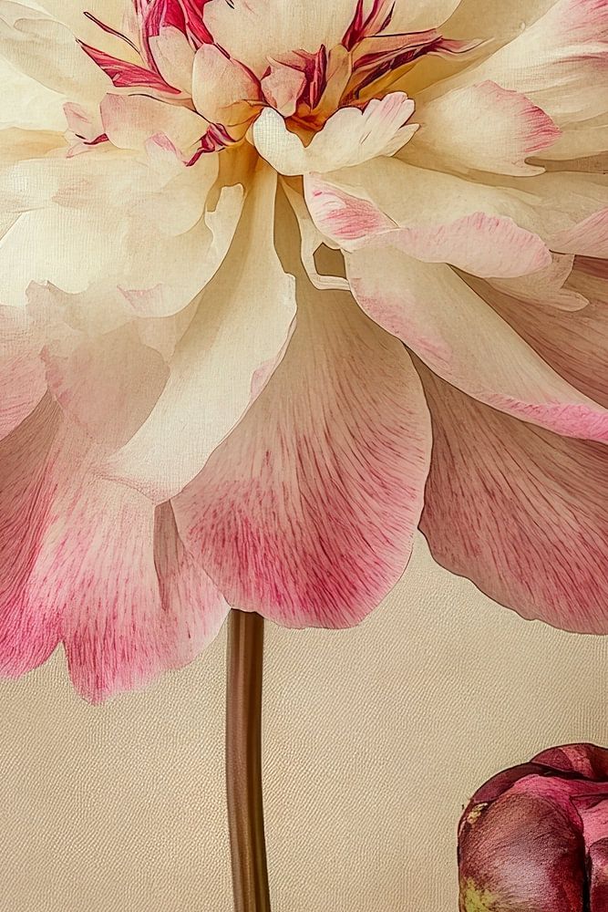 Soft colour nuances of delicate pink and white come together in this floral splendour, reminiscent of the lightness of spring. The fully blooming peony and its elegant bud companion bring freshness and vitality to any room. Ideal for the bedroom, this work of art creates a calming and romantic atmosphere.