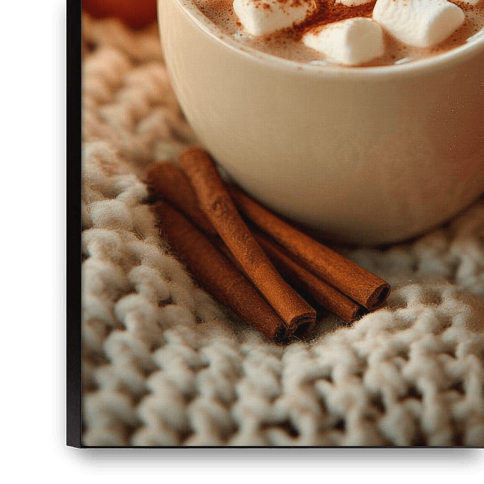 A steaming mug full of creamy chocolate, topped with a fluffy cloud of delicate marshmallows. Surrounded by bright red Christmas baubles and the soft glow of a candle, this wintry treat exudes cosiness and festive cheer. Cinnamon sticks hint at spicy flavours, while the cosy blanket in the background is inviting.