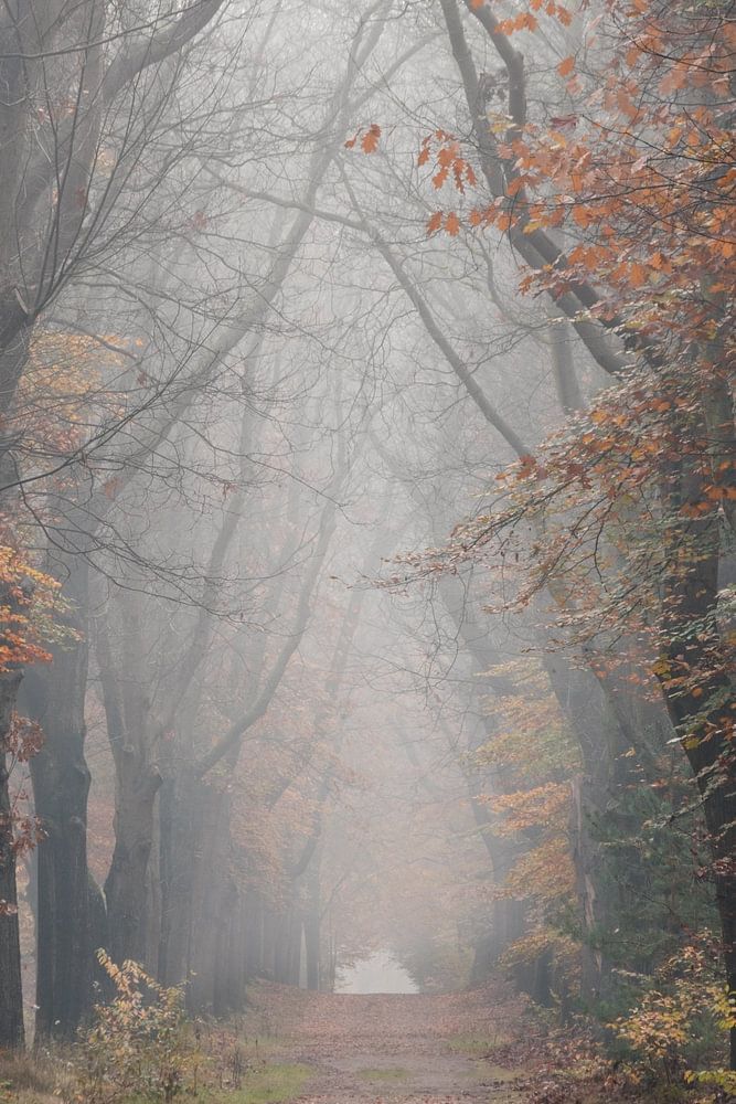 Den Treek-Henschoten on an early morning in autumn. The fog slowly begins to lift as the sun continues to rise and more and more people find themselves in the woods.