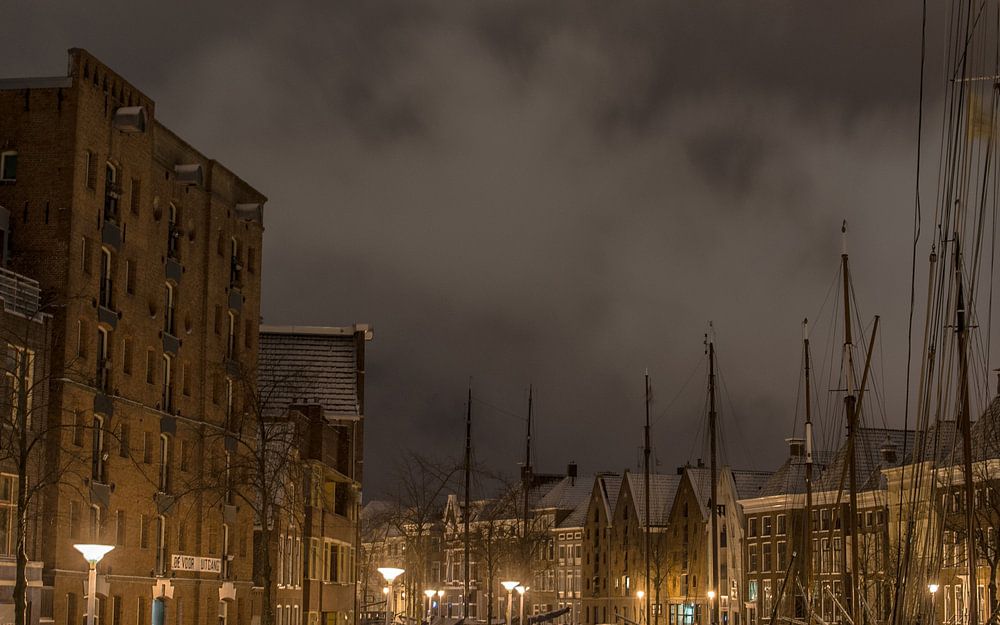 Foto van Groningen vanaf de aa-brug. Gemaakt vlak voor winterwelvaart zou plaatsvinden. De sneeuw geeft de foto een surrealistische look.
