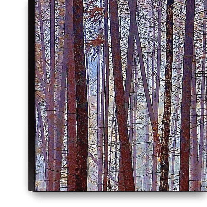 Tribes in an autumn forest. A feast of natural colours. The background is the blue sky behind the trunks. A beautiful natural almost abstract image which will look good with jout but also with stone and steel.