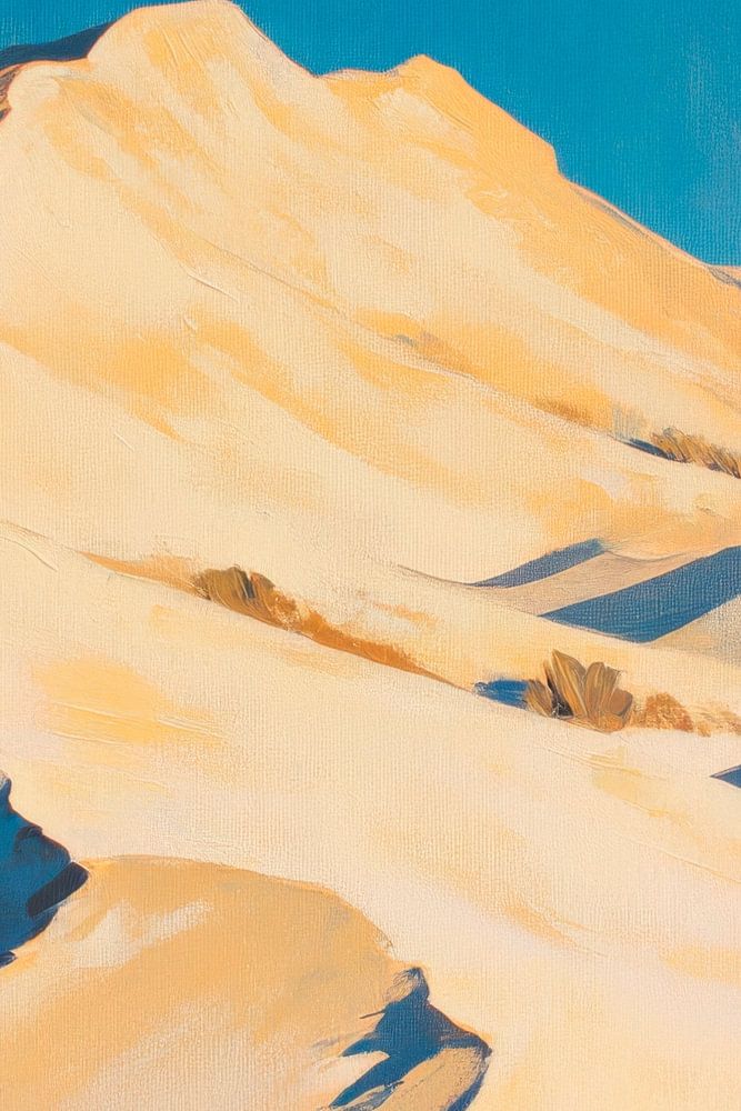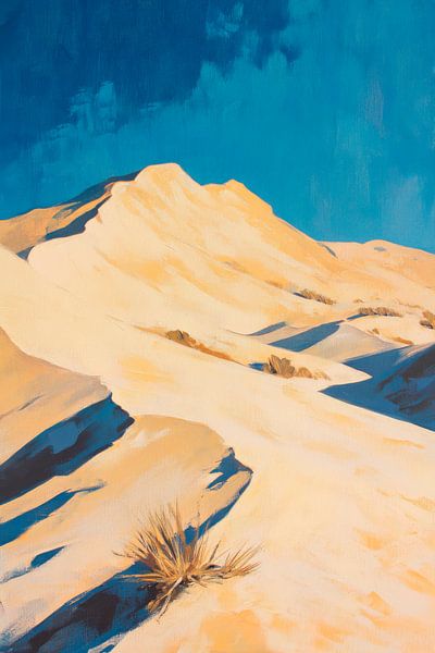 Gentle sand dunes under a bright blue sky transport the viewer to a tranquil, distant landscape. The vivid contrasts and shaded shapes create an inviting atmosphere that is perfect for a living room. Here, natural peace merges with modern elegance, ideal for relaxed conversations and creative thoughts.