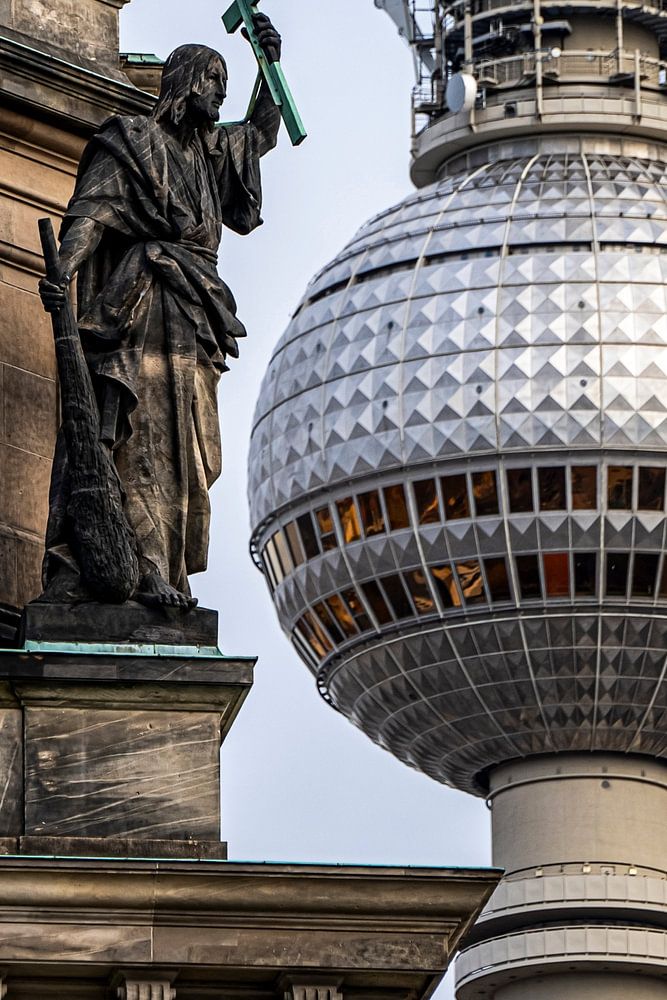 Buy the photo Detail of Berlin Cathedral with the Fernsehturm in the background by Arie de Korte on canvas, ArtFrame, poster and wallpaper, printed on demand in high quality.