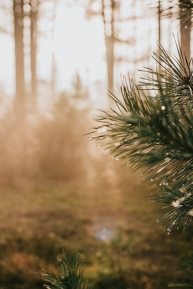 About "Dew drops on a pine branch at sunset on the Veluwe, the Netherlands | nature photography travel phot"