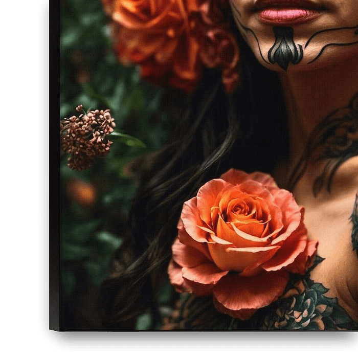 Our fine art print captures the timeless beauty and cultural depth of Día de Muertos in an impressive way. The motif shows a woman with closed eyes, artfully made up in the style of Día de Muertos. She is surrounded by vibrant light and dark orange roses, creating an aura of elegance and remembrance.