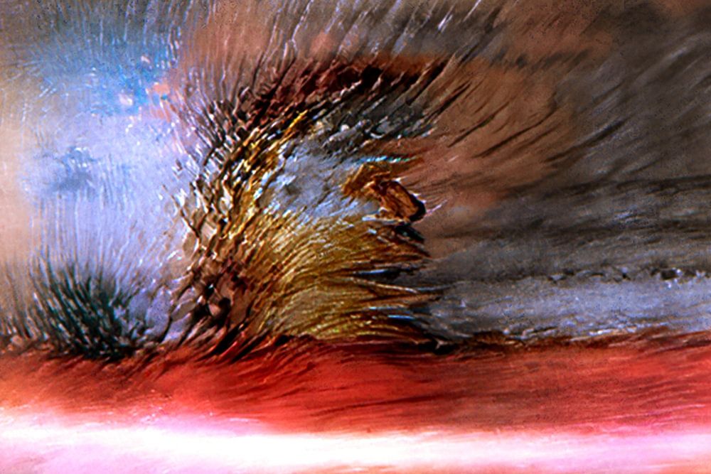 Digital Painting : Eye of the Storm was digitally created by Photoart-Naegele in October 2025. This abstract, luminous image features an explosion of texture and colour, dominated by a deep, spiky brown-orange rising above a bright, glowing red horizontal stripe. The composition is framed by soft transitions in shades of blue and purple, creating a dramatic contrast between glowing energy and cool atmosphere.