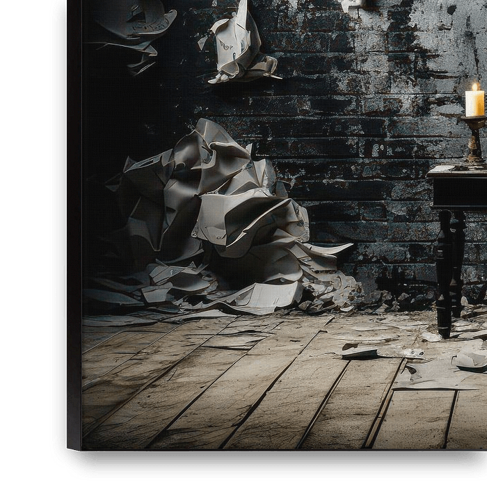 In this artistic composition, the raw texture of an old, weathered brick wall merges with a deep, almost mystical atmosphere. The wall, once solid and stable, now appears to be in a slow process of decay, with flaking plaster peeling off the walls like leaves. Some of the broken pieces are still hanging on the wall, while others are…