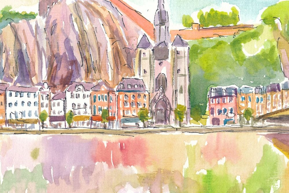 Buy this painting Dinant Belgium Citadel on rocks with Meuse promenade by Markus Bleichner as a reproduction on canvas, ArtFrame, poster and wallpaper, printed on demand in high quality.