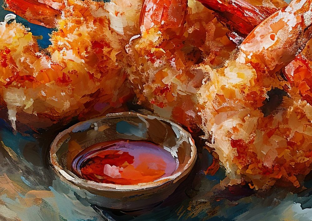 Dinner With Shrimp | Modern Food Art - This vibrant artwork captures the essence of culinary delight with a focus on delicious-looking deep-fried shrimp, delicately served on an understated platter with a dipping sauce alongside. The expressive brushstrokes and warm colour palette of orange, brown and blue tones give the painting a dynamic, modern look that would bring a cosy atmosphere to any dining establishment or kitchen.