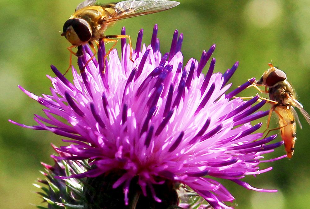 Two hoverflies on a beautiful purple coloured wild flower.