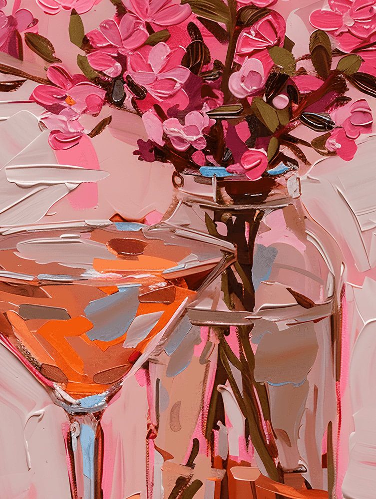 In this artwork, a dirty martini is brought to life in a mix of pink colours and shades, which blend together beautifully and evoke a playful atmosphere.