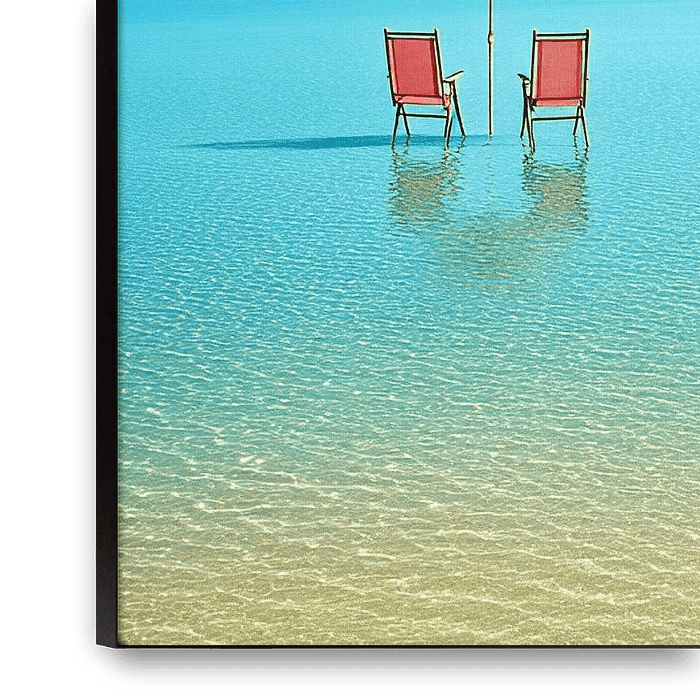 This dreamy art photo shows two chairs in shallow water with subtle yellow accents. Perfect for those looking for summer art, photography of togetherness and original prints with a serene feel. Ideal…