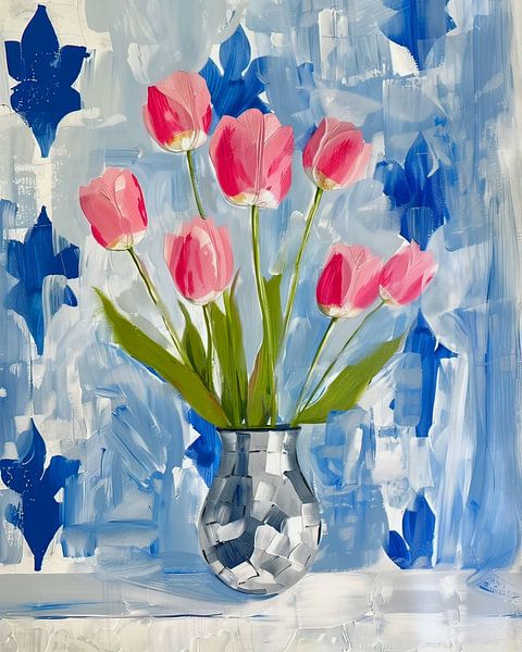 This artwork depicts a bouquet of tulips growing upwards from a disco vase and spreading across the image. The stems start from the centre and carry the flower heads, each following its own direction. The vase stands on a surface and forms a solid centre point in the composition. In the background, areas of paint and shapes appear that…