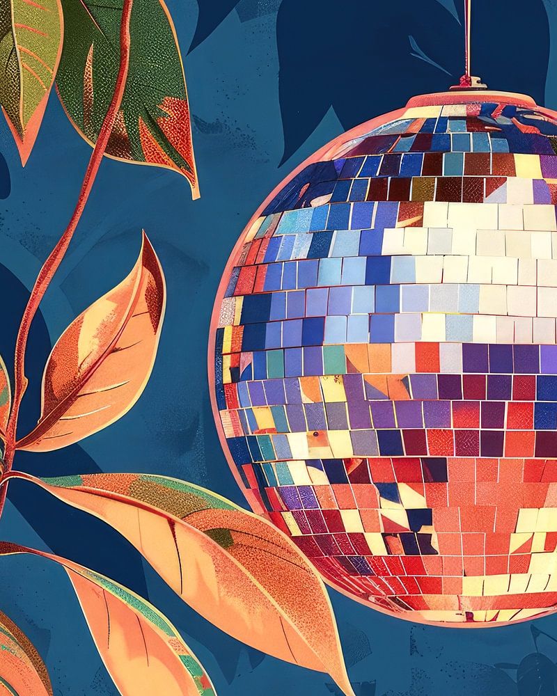 This artwork captures the magic and mystery of a tropical night, where the shimmer of the disco ball and the quiet beauty of the leaves create a unique, dreamy atmosphere.