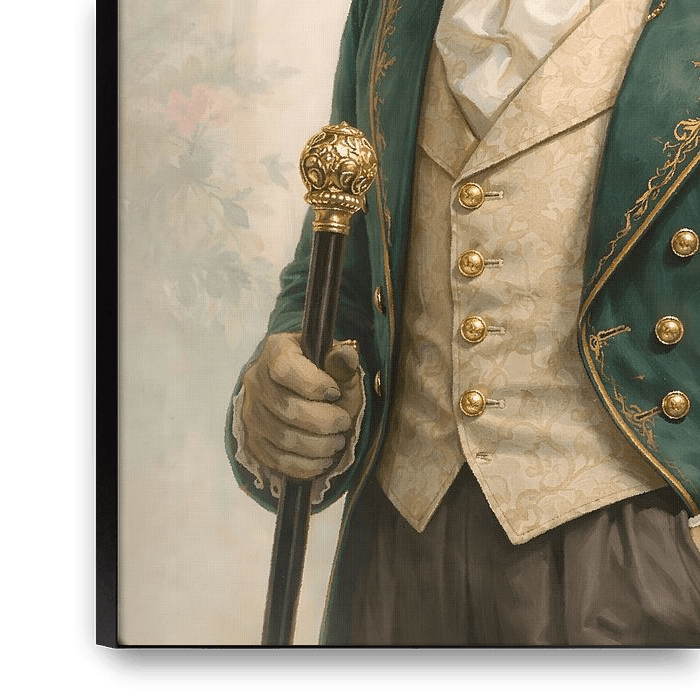 This exquisite digital painting features a capybara portrayed as a sophisticated gentleman from the Regency era. Dressed in a rich emerald green frock coat with intricate gold embroidery and a cream-colored waistcoat, the subject exudes an air of quiet dignity. A classic monocle and a decorative cane add to the scholarly and…