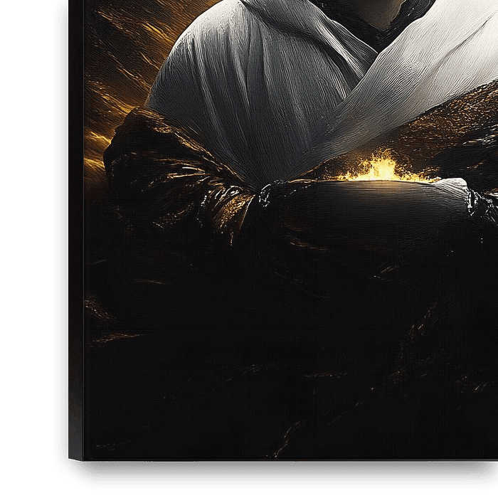 A transcendent figure radiates divine energy, crowned by a halo of light and a wreath of thorns symbolising sacrifice, wisdom and eternal guidance. Against the backdrop of a breathtaking, gold-coloured mountain landscape, this masterpiece embodies the fusion of spirituality and cosmic destiny. The figure holds a glowing ember,…