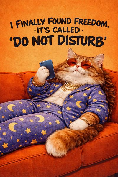 A playful and humorous cat artwork featuring a relaxed feline embracing the ultimate freedom: “Do Not Disturb.” With warm retro colors and a cozy lounge vibe, this piece brings a fun, carefree mood to any space. Perfect for living rooms, bedrooms, home offices, or creative studios that appreciate quirky humor and modern pop-style wall…