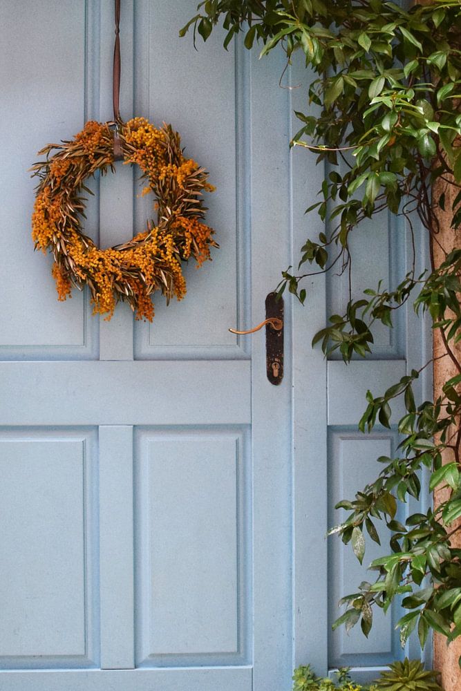 Rovinj is a pretty little coastal town in Croatia. You can spend hours wandering around the small streets there. I too did so and took this photo there. The pretty soft blue door with the yellow wreath.