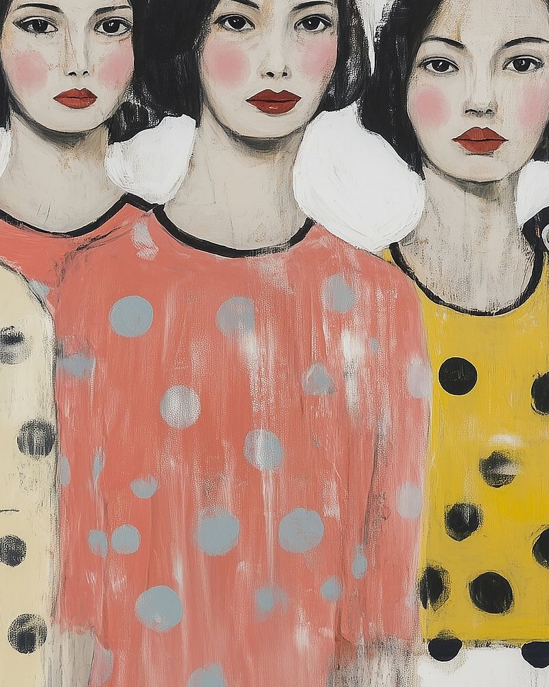 Dotted Harmony is an abstract art representation of five women with dark short hair, each dressed in dresses with a playful pattern of dots. The colours red, yellow, black, and white alternate, with the contrasts of these shades coming together harmoniously. The women stand side by side on a minimalist white background, which puts the focus on the vibrant patterns and colours of their clothes. Their stylised silhouettes exude a sense of unity and balance, despite the diversity in colour and pattern. The whole looks like a dance between form and colour, where simplicity and abstraction meet. Modern Abstract.