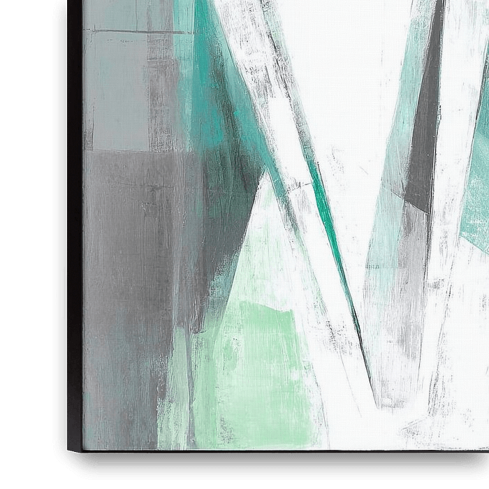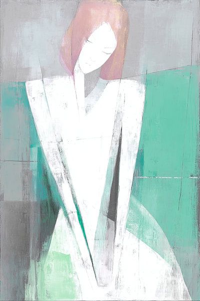 Het tweede, even dominante element is de brede mintgroene kleur die aan de rechterkant en ondergrond van het doek ligt, een koele, licht gekwesteerde kleur die het witte lichaam flankert en laat spreken. Die mint- of turquoise-vlakte is niet egaal: er zitten plekken van doorzichtige lagen, zijdelingse krassen en zachte overgangen, alsof je naar een oud fresco kijkt dat opnieuw is gepoetst. De combinatie van het strakke wit en die rustige groenige achtergrond geeft het schilderij zijn toon — modern, sereen en iets melancholisch. Als zoekterm: vrouw schilderij met mint achtergrond is precies wat deze compositie definieert.