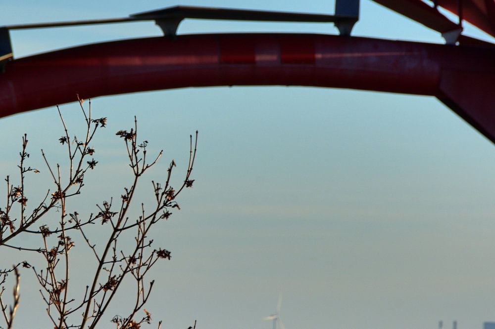 Dragon bridge in Herten leading to the Hoheward slagheap, in the background the Datteln 4 power station