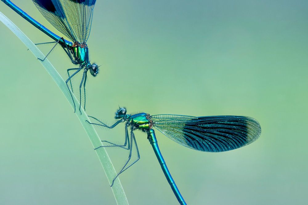 These Dragonflies (meadow damselflies) were warming up in the sun early this morning. Always nice to meet them this way. Dragonflies and damselflies cannot fly until they are warmed up by the sun. On a beautiful summer morning, I saw these meadow creek damselflies sitting on their roost and how beautiful that they were sitting so perfectly in front of each other. These are two males, as the females have a metallic green colour. For me, these are very beautiful mornings in nature. I do get up very early then to find the insects still in their roosts. Because once the sun has warmed up the insects, they fly right into a new day. A beautiful work above the sofa, in a hair salon, canteen or restaurant. Should you purchase this work, I wish you a lot of pleasure from it.