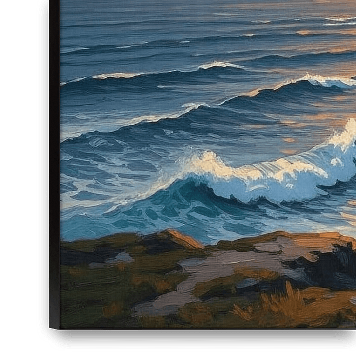 This artwork captures a dramatic coastal landscape at sunset, where towering ocean cliffs meet powerful rolling waves. The warm golden light of the setting sun reflects across the water, creating a striking contrast with the deep blue tones of the sea and sky. Thick, expressive clouds add movement and atmosphere, enhancing the sense of…