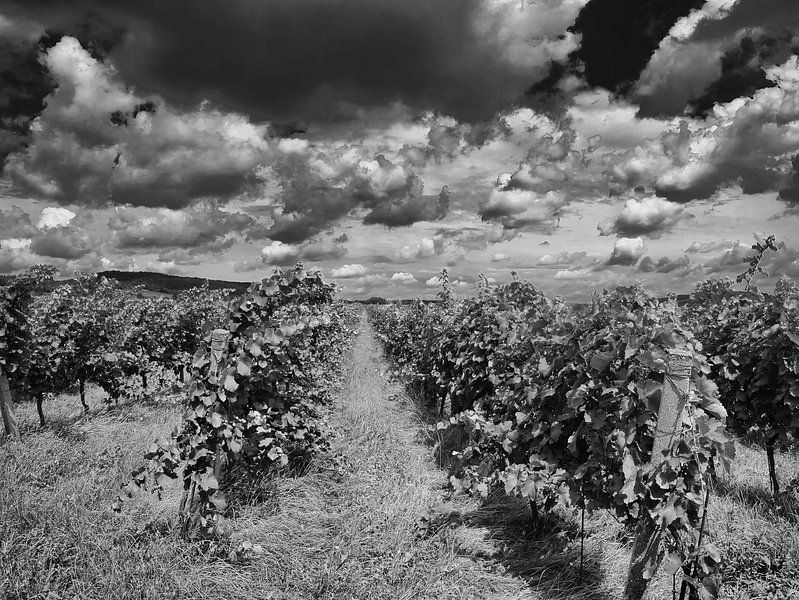 This black-and-white photograph shows a vineyard in summer, but the real protagonist of the image is the sky. Powerful, sculptural clouds drift across the vines in dense formations, lending the scene an impressive, almost dramatic atmosphere. The vines stand in clearly structured rows that stretch in a straight line into the depth of…