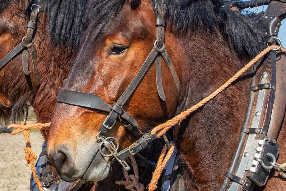 Spring work in a field near Kwadendamme by The Zeeland Working Draft Horse Foundation. The field is worked in the authentic way with old machines and draft horses, here the plowed field is prepared for fertilizing and planting potatoes.
