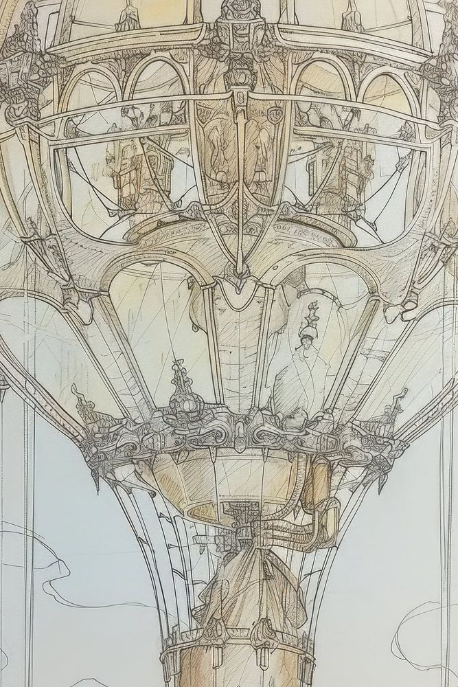 Drawing of an ornate hot air balloon with detailed design. Combination of technical and fine art, illustration, precise line drawing with shading techniques that give depth and texture to the image. The colours are muted shades of blue, beige, brown and gold, contributing to the vintage look.
