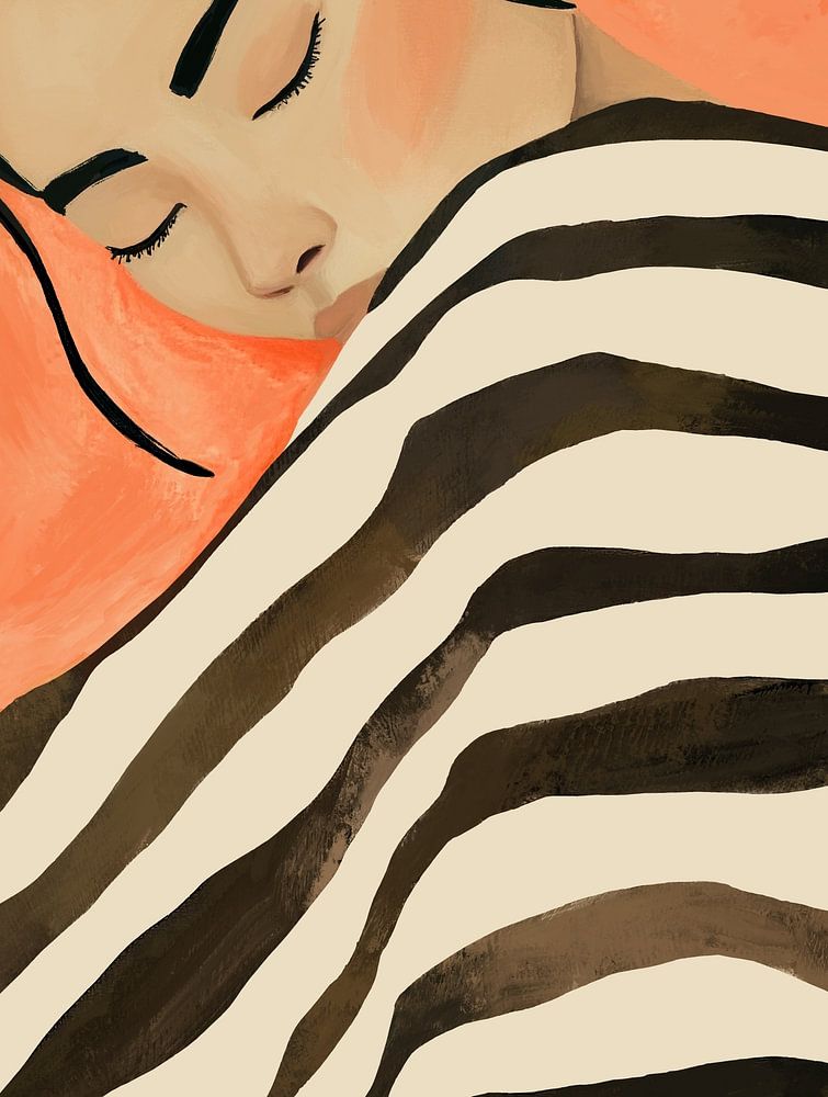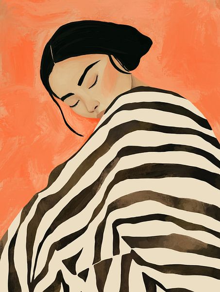 A serene illustration of a woman with closed eyes, wrapped in a flowing black-and-white striped fabric against a bold, warm coral background. The contrast of soft expression and striking patterns creates a balance between calmness and intensity