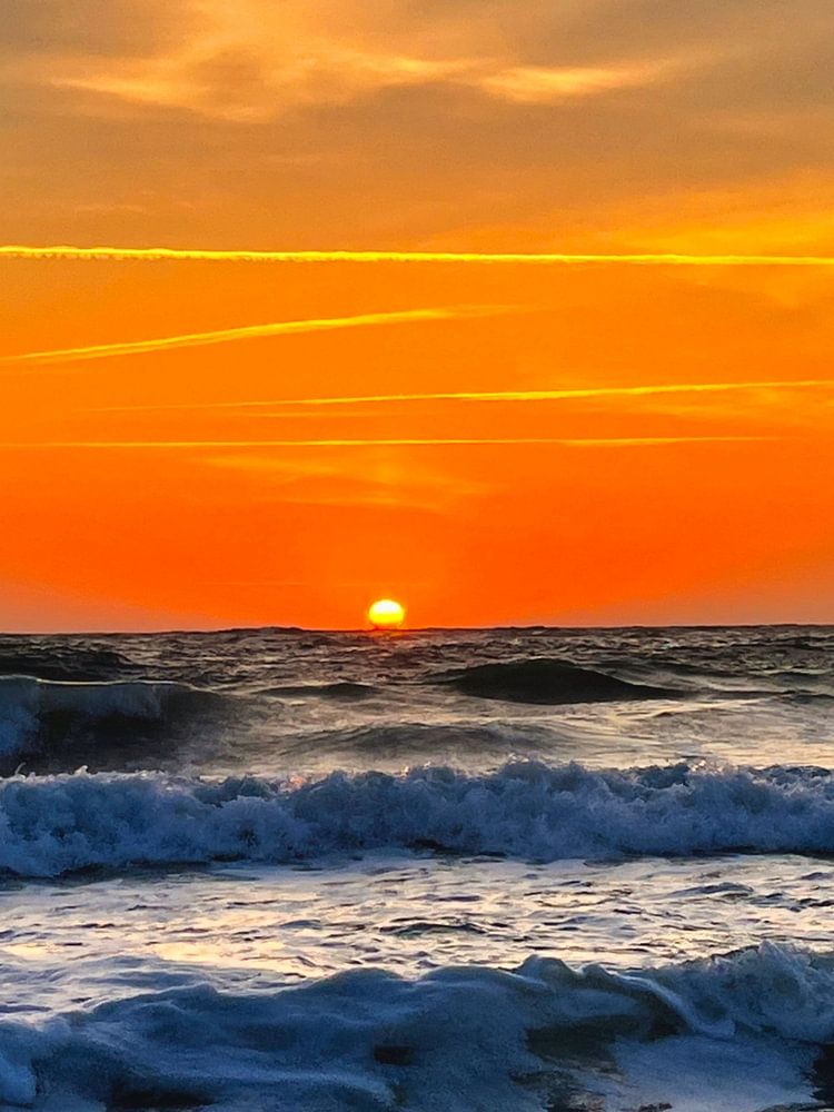 The undulating expanse of the sea stretches as far as the horizon and presents itself with impressive imposingness. The sun bends low over the waves and the water becomes a living, moving canvas. Each wave carries the reflection of the intense orange and red of the sky as it rolls powerfully towards the horizon.