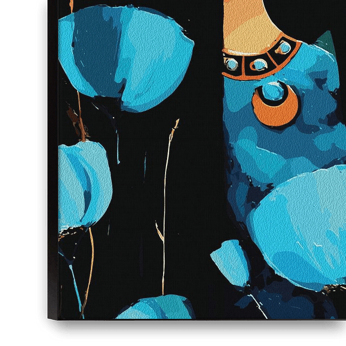 This modern fantasy artwork features a peaceful woman leaning beside a dark horse, surrounded by vibrant turquoise floral accents. The expressive brushwork and harmonious colors give the piece a soft emotional depth, making it perfect for collectors who appreciate feminine, nature-inspired, and contemporary artistic styles.