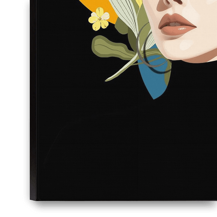 Digitally produced portrait of a beautiful, fashion-conscious woman in black clothing, on a background of flowers and leaves, colours and shapes.