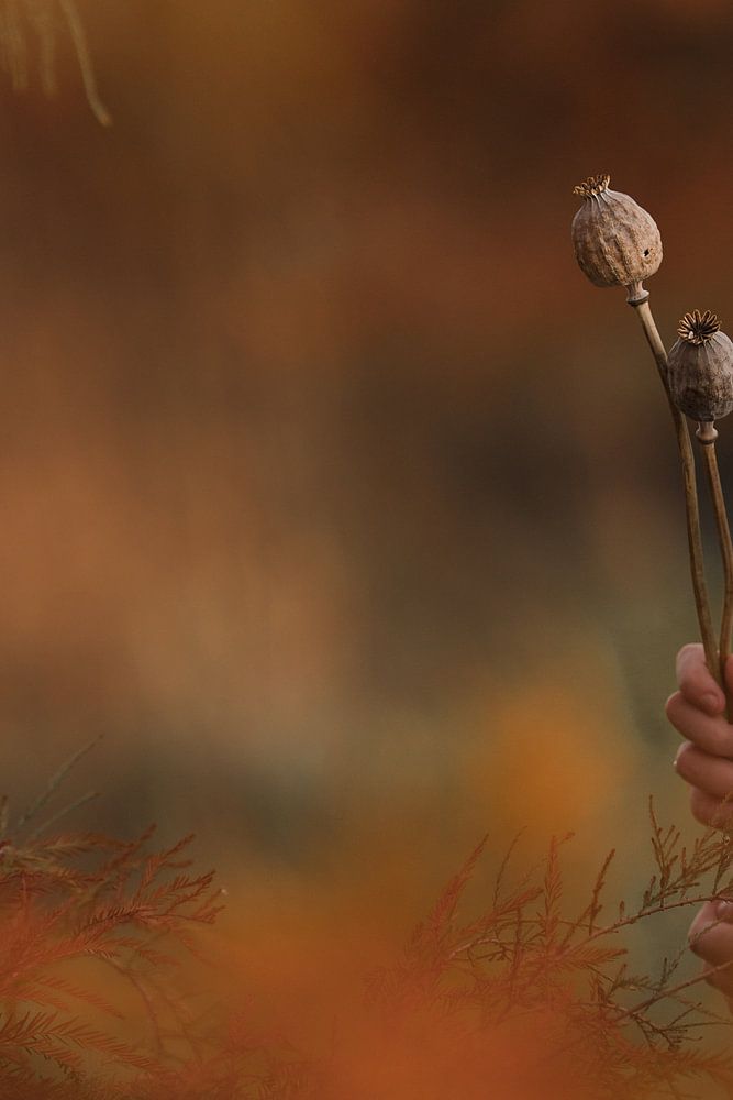 Autumn atmospheric plate with poppy dried flowers. Poppy is the dried seed pod of the poppy. The hands with the dried stems of poppy seed pods are photographed with little depth of field; this gives a nice blurred foreground and background. Branches with poppy seed pods are widely used as decoration in interiors; but also beautiful as wall decoration! It is a calming image. The warm autumn colors give extra atmosphere to the photo. It's extra nice to combine this photo with my other autumn pictures!