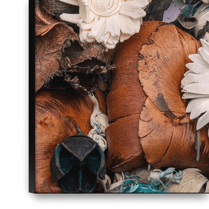 This work of art features an artfully arranged composition of dried plants and floral elements that combine both naturalness and aesthetics. Three white flowers take centre stage, their elegant shape and fine texture reminiscent of porcelain. They appear like silent protagonists in a rich ensemble of dried materials, including delicate…