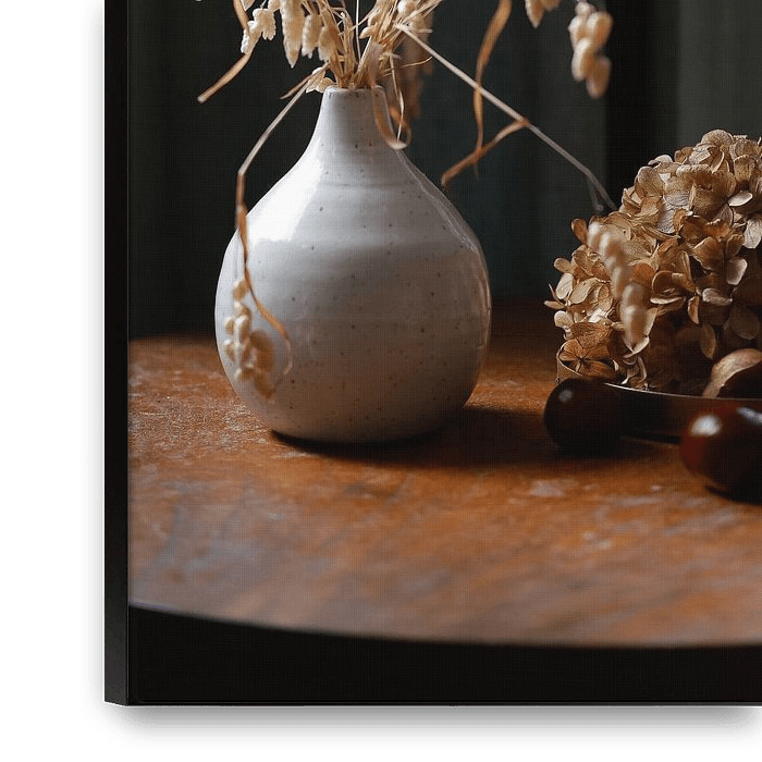 An arrangement of dried grasses, chestnuts and a dried hydrangea flower create a cosy impression. You immediately feel at home and welcome. The photo in earthy tones suits many furnishing styles, rooms and professional contexts (e.g. doctors' surgeries, restaurants, etc.).