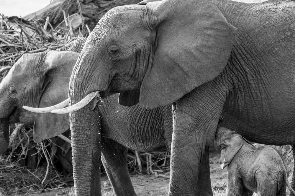 Drinking elephants by river in black and white by Dave Oudshoorn